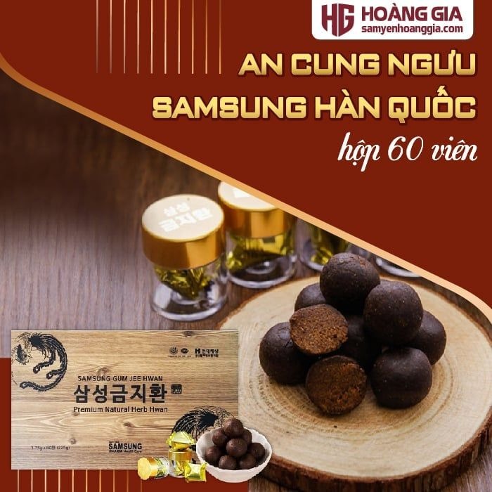 An Cung 60 Viên Hộp Gỗ Samsung Hàn Quốc Xuất xứ : GumJeeHwan Hàn Quốc Quy cách : Hộp 60 viên x 3,75gr Hạn sử dụng : 2 năm An Cung Ngưu Hoàng hộp gỗ có tem Samsung là sản phẩm nổi tiếng Hàn Quốc chuyên phòng ngừa và hỗ trợ đ/i/ề/u t/r/ị bệnh tai biến, đột quỵ. Ngoài ra An Cung Ngưu Hoàng còn thích hợp dùng cho các đối tượng có tiền sử bệnh tim mạch, cao huyết áp, thiếu máu não, rối loạn tiền đình, thần kinh yếu... Cách Dùng An Cung 60 Viên Hộp Gỗ Samsung Hàn Quốc - Thích hợp nhất cho người từ 30 tuổi trở lên - Ngày dùng 1 viên, có thể nhai, ngậm hoặc dùng với nước ấm - Người huyết áp cao, bệnh về tim, thận...nên tham khảo ý kiến bác sĩ khi dùng - Không dùng quá liều lượng chỉ định. Chú ý : Sản Phẩm Không Phải Là thuốc và không có tác dụng thay thế thuốc chữa bệnh9