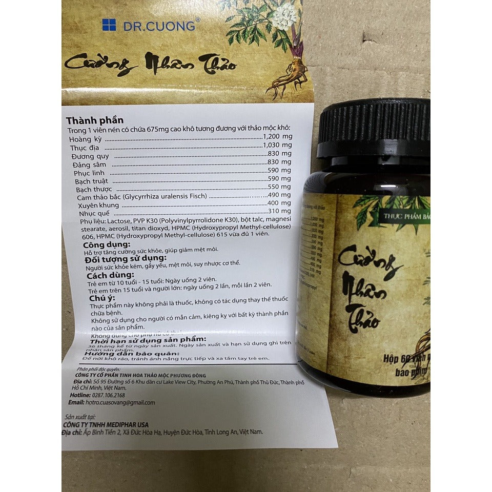 Cường Nhân Thảo - Thực phẩm bảo vệ sức khỏe - Sản phẩm gồm 2 dạng: Siro và viên nang. THÀNH PHẦN: Đối với sản phẩm dạng viên (hộp 60 viên): - Trong một viên nén có chứa 675mg cao khô tương đương với thảo mộc khô: Hoàng kỳ 1200mg; Thục địa 1030mg; Đương quy 830mg; Đảng sâm 830mg; Phục linh 590mg; Bạch truật 590mg; Bạch thược 550mg; Cam thảo bắc (Glycyrrhiza uralensis Fisch) 490mg; Xuyên khung 400mg; Nhục quế 310mg. Phụ liệu: Lactose, PVP K30 (Polyvinylpyrrolidone K30), bột talc, Magnesium stearate, aerosil, Titanium dioxide, HPMC (Hydroxypropyl Methyl-cellulose) 605, HPMC (Hydroxypropyl Methyl-cellulose) 615 vừa đủ 1 viên. Đối với sản phẩm dạng siro chai (125ml): - Trong 10ml có chứa 1350mg cao khô tương đương với thảo mộc khô: Hoàng kỳ 2400mg; Thục địa 2060mg; Đương quy 1660mg; Đảng sâm 1660mg; Phục linh 1180mg; Bạch truật 1180mg; Bạch thược 1100mg; Cam thảo bắc (Glycyrrhiza uralensis Fisch) 980mg; Xuyên khung 800mg; Nhục quế 620mg. Phụ liệu: Đường Saccharose, Sorbitol, Natri benzoat, Acid citric, Natri citrat, Nước tinh khiết vừa đủ 10ml. CÔNG DỤNG: - Hỗ trợ hỗ trợ tăng cường sức khỏe, giúp giảm mệt mỏi. ĐỐI TƯỢNG SỬ DỤNG: - Người sức khỏe kém, gầy yếu, mệt mỏi, suy nhược cơ thể. CÁCH SỬ DỤNG: Đối với sản phẩm dạng viên nang: - Trẻ em từ 10 tuổi - 15 tuổi: Ngày uống 2 viên. - Trẻ em trên 15 tuổi và người lớn: Ngày uống 2 lần, mỗi lần 2 viên.