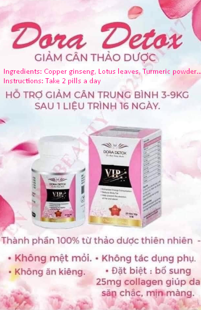 DORA DETOX VIP công thức của Nhật Bản. Hỗ trợ giảm cân an toàn ,hiệu quả - THÀNH PHẦN : Mỗi viên nang 500mg chứa : Đẳng sâm...... ............100mg Lá sen ........................100mg Tinh bột nghệ ............50mg Chè vằng ....................50mg Tinh dầu bưởi..............50mg Chùm ngây..................50mg Linh chi vàng...............50mg Khổ qua........................25mg Collagen.......................25mg - CÔNG DỤNG : +Ức chế sự tích tụ chất béo trong cơ thể + Hoá lỏng mô mỡ + Chuyển hoá chất béo thành năng lượng + Collagen giúp da săn chắc ,mịn màng - HƯỚNG DẪN SỬ DỤNG : Đối với người mới sử dụng 4 ngày đầu dùng 1 viên/1 ngày . Từ ngày thư 5 trở đi 2viên/1ngày . LƯU Ý: - Sản phẩm không dùng cho người dưới 16 tuổi và trên 50 tuổi. - Phụ nữ mang thai , người bệnh tim mạch , huyết áp , cường giáp . - Người mẫn cảm với các thành phần của sản phẩm. SẢN PHẨM KHÔNG PHẢI LÀ THUỐC KHÔNG THAY THẾ THUỐC CHỮA BỆNH. Khách hàng tư vấn hãy ib ngay