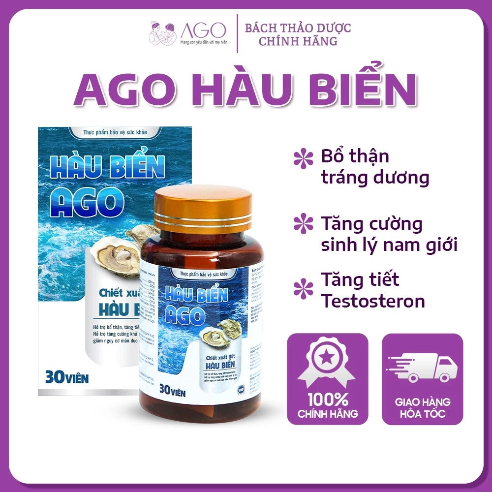 Hàu biển Ago giúp hỗ trợ bổ thận, tăng tiết testosteron. Hỗ trợ tăng cường khả năng sinh lý và hỗ trợ giảm nguy cơ mãn dục sớm ở nam giới.100% thảo dược thiên nhiên như nhục thung dung, dâm dương hoắc, chiết xuất thịt hàu biển, vv…được Bộ Y Tế chứng nhận, có chứng chỉ FDA xuất khẩu Hoa Kỳ, tiêu chuẩn GMP