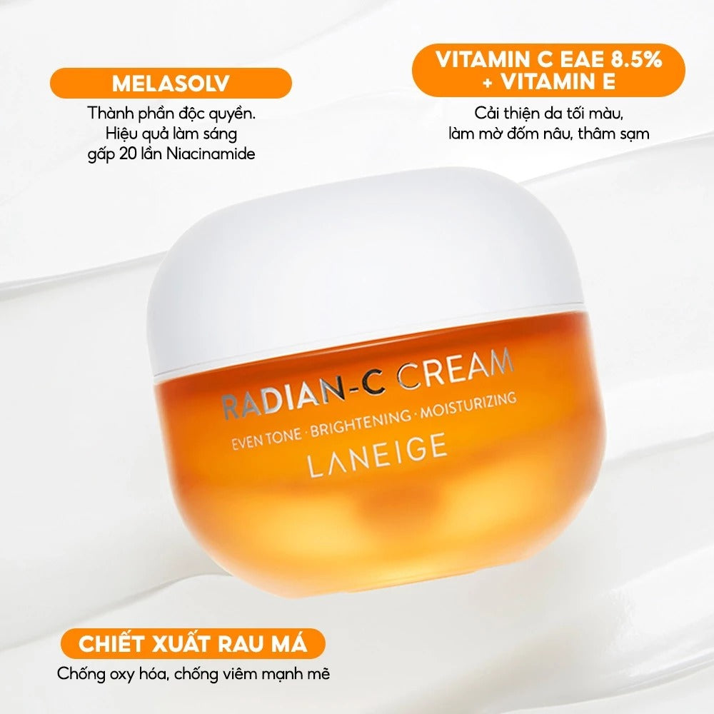 - Kem dưỡng trắng da mặt Laneige Radian C 50ml với thành phần chính được chiết xuất các phân tử vitamin C siêu nhỏ chứa hàm lượng Vitamin C cao gấp 60 lần so với trái cam thông thường.
