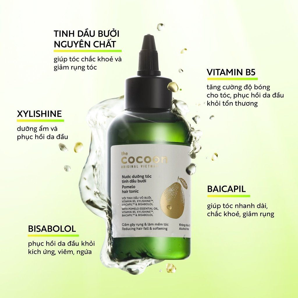 Cocoon của Việt Nam. Nước dưỡng tóc tinh dầu bưởi phiên bản nâng cấp là sản phẩm treatment dành cho tóc, phù hợp với tình trạng tóc rụng, tóc yếu, tóc thưa mỏng. Bên cạnh các thành phần chủ đạo của phiên bản hiện tại (tinh dầu bưởi Việt Nam truyền thống, Xylishine, vitamin B5), phiên bản nâng cấp được bổ sung thêm 2 hoạt chất là Baicapil và Bisabolol hỗ trợ giảm mạnh mẽ tình trạng rụng tóc và tăng cường độ chắc khoẻ cho mái tóc.