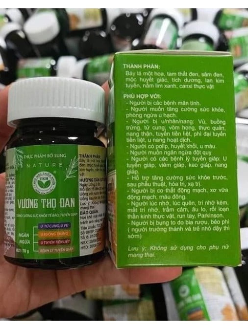 Thành Phần: Vương Thọ Đan Trần Kim Huyển - Thực Phẩm Bổ Sung Gia Tăng Đề Kháng - Bảy lá một hoa: Nghe tên vô cùng kì lạ, nhưng loại cây này có khả năng trong việc điều hòa khí huyết vô cùng hiệu quả. Chúng được sử dụng khá phổ biến ở nhiều sản phẩm đông y khác. - Tam thất đen: Được mệnh danh là khắc tinh của vi khuẩn và các tế bào ung thư. Chúng giúp cơ thể tăng cường sức đề kháng và hệ miễn dịch vô cùng hiệu quả - Sâm đen: Vốn có đặc tính lợi tiểu, bổ trợ dương khí. Thích hợp cho việc hỗ trợ và phòng chống các trường hợp yếu sinh lý ở cả nam và nữ. Đây là loại dược liệu không thể thiếu trong bất kì sản phẩm về vùng kín - Mộc huyết giác: Ổn định máu và cân bằng được việc lưu thông máu trong tế bào - Tích dương: Giải quyết các bệnh liên quan đến vô sinh ở nữ giới. Đặc biệt phòng ngừa các triệu chứng liên quan đến tuyến tiền liệt ở nam - Nấm lim xanh: Hỗ trợ chống lại u, tuyến giáp hiệu quả - Canxi thực vật Công Dụng: Vương Thọ Đan Trần Kim Huyển - Thực Phẩm Bổ Sung Gia Tăng Đề Kháng - Hỗ trợ tăng cường sức khỏe trước, sau phẫu thuật, hóa tr.ị, xạ tr.ị - Ngăn ngừa u t.ử cung, u bu.ồng trứ.ng, u tuy.ến ti.ền liệt, tuyến giáp,… - Loại bỏ độc tố, mỡ dư th.ừa trong cơ thể - Tăng cường sức đề kháng - Người mất trí nhớ hoặc trí nhớ kém Đối Tượng Sản Phẩm: Vương Thọ Đan Trần Kim Huyển - Thực Phẩm Bổ Sung Gia Tăng Đề Kháng - Người bị các triệu chứng mãn tính - Người muốn tăng cường sức khỏe, phòng ngừa u hạch - Người bị u/nhân/nâng: V.ú, bu.ồng tr.ứng, t.ử cung, vòm họng, thực quản, nang thận, tuyến tiền liệt, phì đại tuyến tiền liệt, u nang hoạt dịch - Người có polyp, huyết khối, u máu - Người muốn ngăn ngừa đ.ột qu.ỵ - Người mắc các triệu chứng về tuyến giáp: U tuyến giáp, viêm giáp, keo giáp, nang giáp - Người bị co thắt động mạch, xơ vữa động mạch, máu đông - Người lúc nhớ, lúc quên, trí nhớ kém, mất trí nhớ, trầm cảm, âu lo, rối loạn thần kinh thực vật, run tay, Parkinson - Người bị bụng to do bia rượu, béo phì (người trưởng thành và trẻ nhỏ dậy thì sớm) Hướng Dẫn Sử Dụng - Ngày uống 2 lần - Mỗi lần uống 15-20 viên - Uống với nước ấm khoảng 30ºC - Sử dụng sau ăn 30 phút Lưu ý: - Không dùng cho phụ nữ mang thai và đang cho con bú. - Vương thọ đan TKH không phải là thuốc và không có tác dụng thay thế thuốc chữa bệnh Bảo quản Nơi khô mát, nhiệt độ < 30 C, tránh ánh nắng mặt trời. Tránh xa tầm tay trẻ em