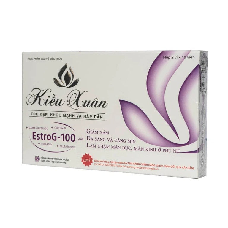 Kiều Xuân nhờ kết hợp Estro G 100 với các tiền nội tiết từ củ từ, củ mài đắng cùng hàng loạt các chất chống oxy hóa mạnh từ tự nhiên như collagen, glutathione, curcumin, gamma oryzanol cho hiệu quả tăng cường nội tiết tố, mờ nám, sáng da.